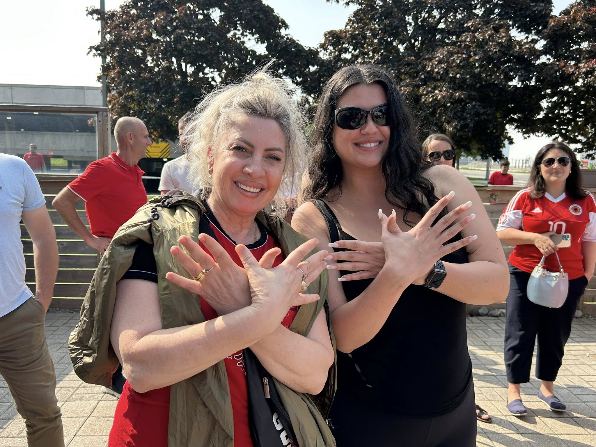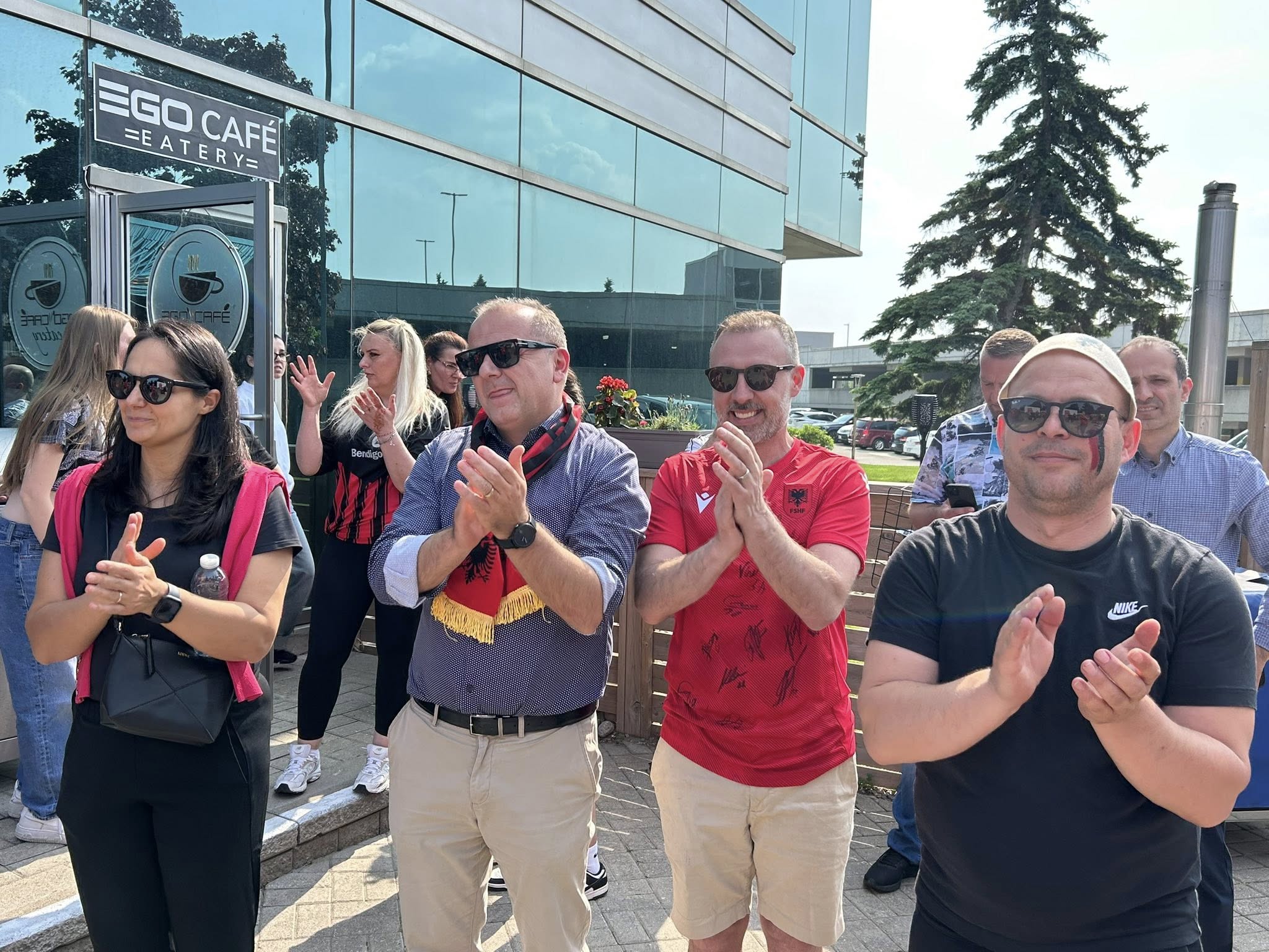 🌟 Atmosfera ishte mbresëlënëse – me flamuj kuq e zi, fytyra të buzëqeshura dhe shumicën e të pranishmëve të veshur me ngjyrat e kombëtares shqiptare, në përkrahje dhe krenari kombëtare.