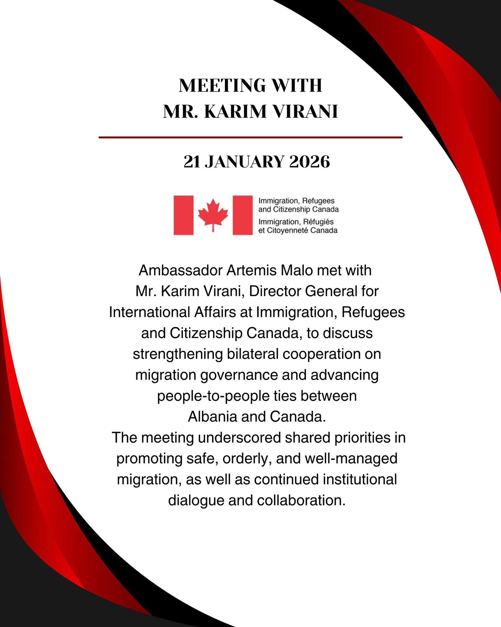 Ambasadorja e Shqipërisë në Kanada, Artemis Malo, zhvilloi një takim me Karim Virani, Drejtor i Përgjithshëm për Çështjet Ndërkombëtare pranë Immigration, Refugees and Citizenship Canada, me fokus forcimin e bashkëpunimit dypalësh në fushën e qeverisjes së migracionit dhe thellimin e marrëdhënieve ndërnjerëzore ndërmjet Shqipërisë dhe Kanadasë.